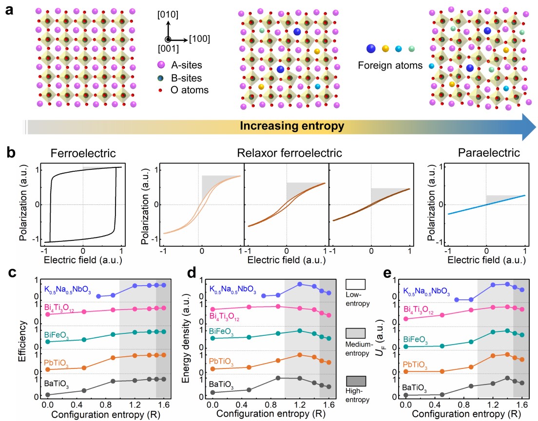 图3.材料的结构异质性、弛豫度、极化特性以及储能性能随熵的演变