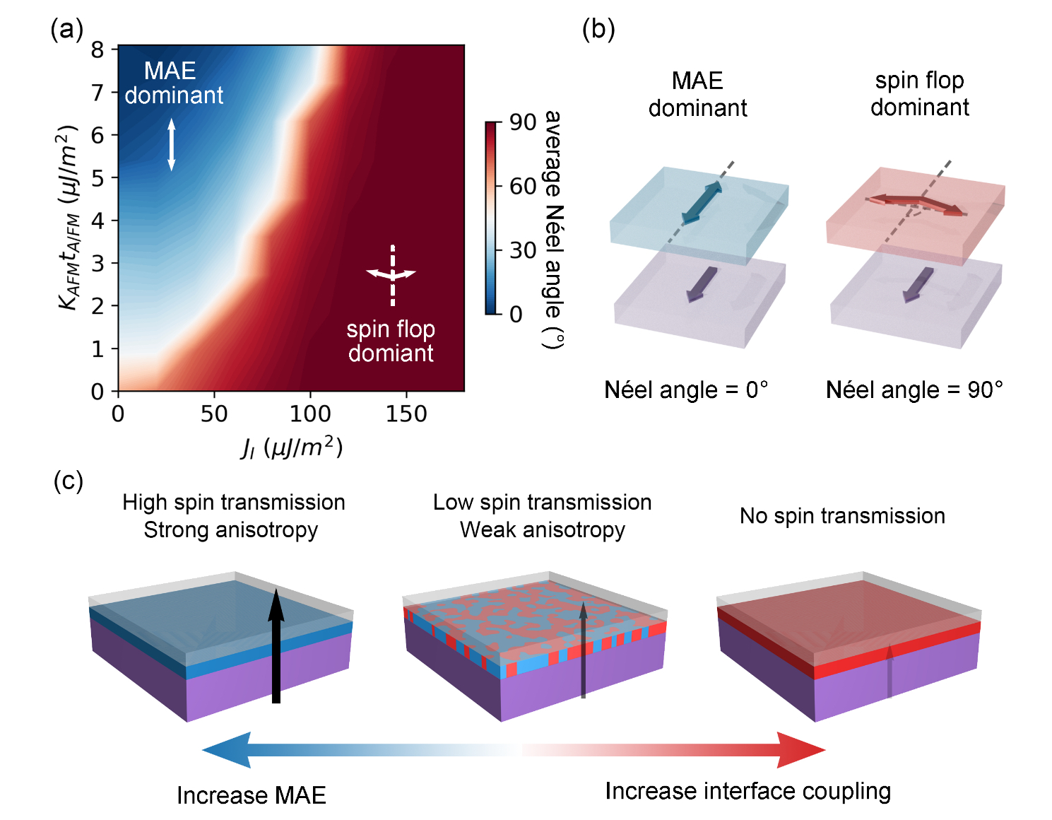 研究团队进一步结合软X射线磁线性二色谱(XMLD),揭示了界面耦合强度与反铁磁层的磁晶各向异性竞争驱动LaFeO3的奈尔矢量重定向,并通过微磁模拟揭示了磁振子输运特性转变的微观物理机制(图5)。研究结果揭示了界面对异质结中磁振子输运的关键影响,为发展反铁磁磁子器件提供了新的理论基础与设计思路。