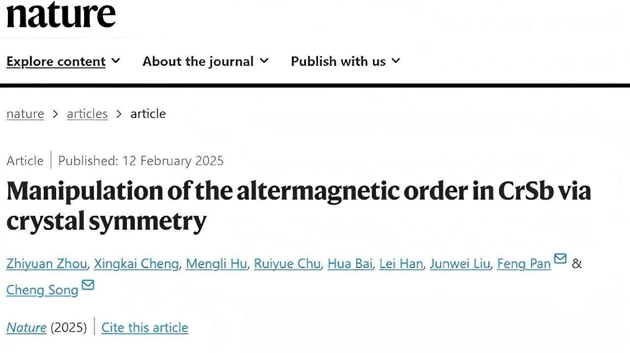 基于重构后的交错磁体,首次在交错磁体中实现室温自发的反常霍尔效应,为基于交错磁体的信息存储器件的数据读出提供了重要契机,提出了交错磁体序参量的零磁场电学翻转判据: 当电流产生的自旋极化(p)、奈尔矢量(n)和Dzyaloshinskii-Moriya矢量(D)两两之间均存在垂直分量时,180度电学翻转可以在零磁场的条件下实现。交错磁体在晶格层面的可调控特征丰富了其序参量电学翻转的物理机制。研究团队实现了有、无磁场辅助的两类电学翻转模式,翻转效率均比铁磁高一个数量级,为交错磁体信息存储单元的低功耗数据写入提供了新策略。相关研究成果以题为《利用晶体对称性操控锑化铬中的交错磁体序参量》(Manipulation of the altermagnetic order in CrSb via crystal symmetry)在《Nature》期刊在线发表。
