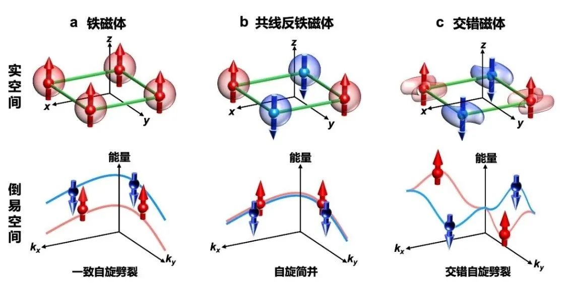 铁磁、反铁磁和交错磁体的自旋构型对比